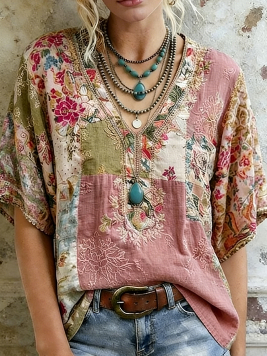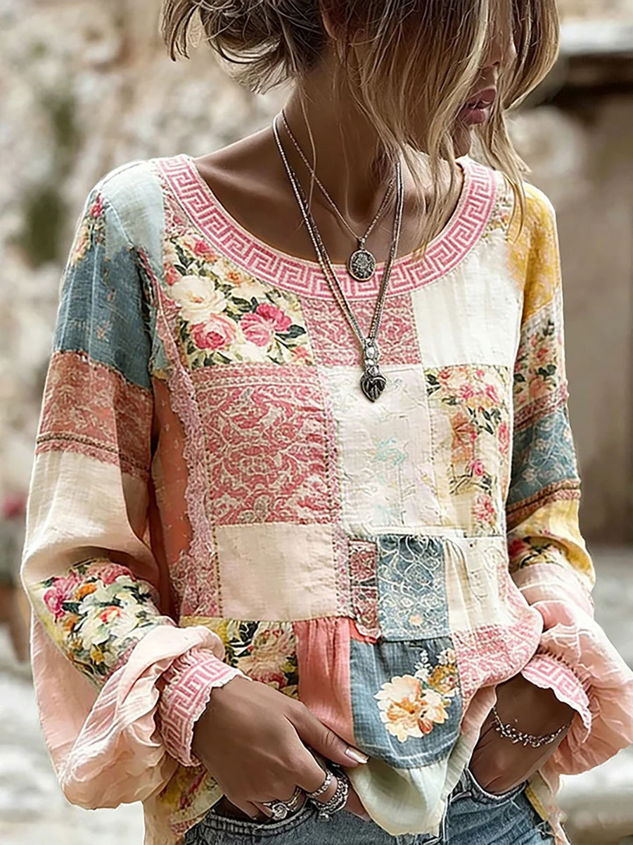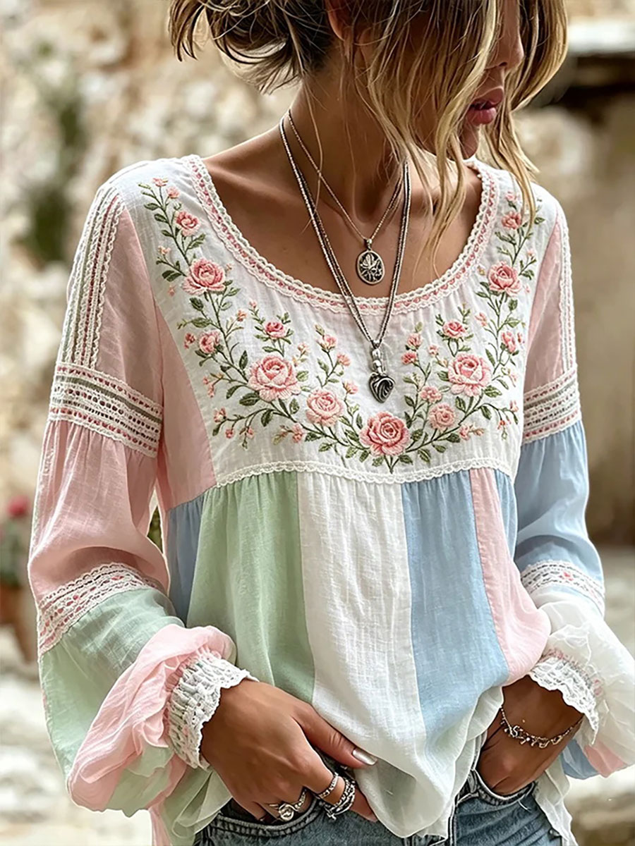 Camicia di lino patchwork elegante in pizzo da donna