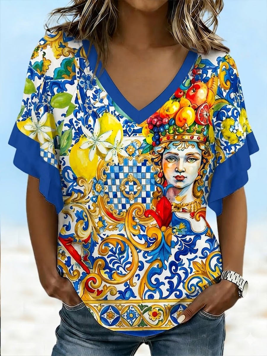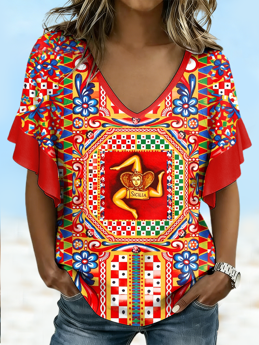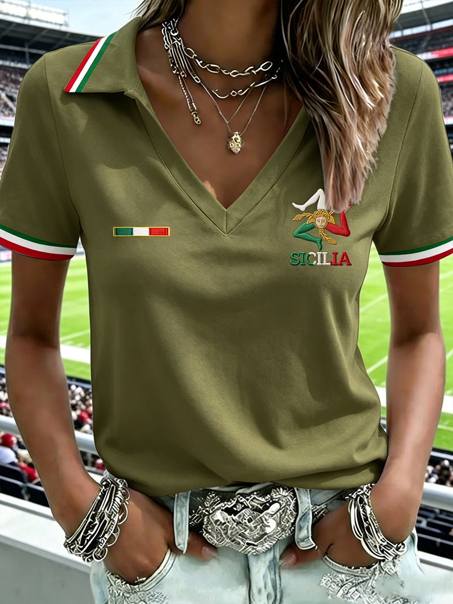 T-shirt da donna Sicilia Trinacria con scollo a V e maniche corte