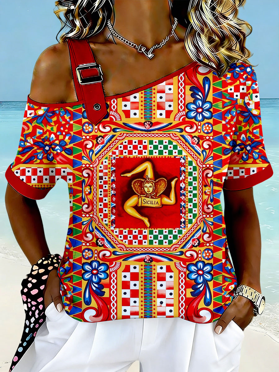 T-shirt da donna Sicilia Trinacria a spalle scoperte con maniche corte